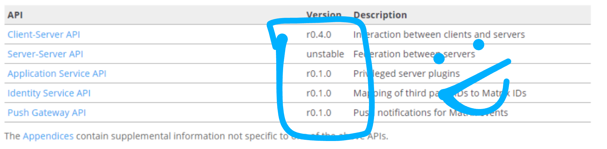 - ...and many many other minor bug fixes, omission fixes, and restructuring for coherency - see https://github.com/matrix-org/matrix-doc/issues/1464 for an even longer list :)