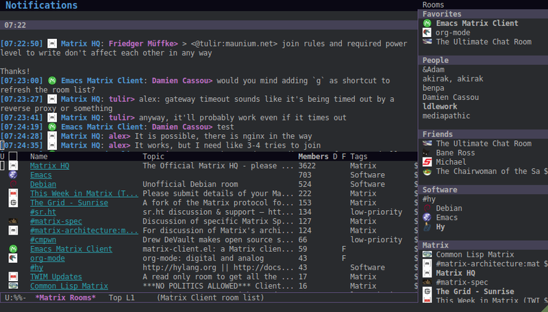 matrix-client.el gained a room-list buffer, which can be sorted by unread status, name, number of members, etc, and has a right-click context menu like the room-list sidebar.