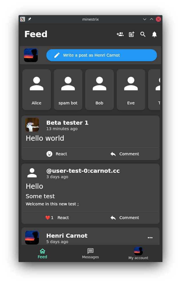 Today I want to showcase you MinesTRIX. MinesTRIX is a decentralized social media based on matrix. The goal is to create a privacy respectful social media using the power of matrix while trying to be as simple as possible.