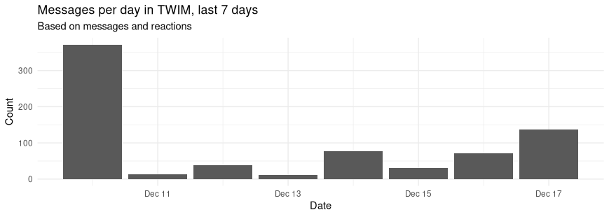 A project has started to re-implement the venerable mIRCstats for Matrix! It's in very early stages, right now it only does "getting a data-frame of events for a list of rooms" and has no actual visualisations baked in yet. However, we're moving quickly, and I hope to have some initial easy-to-use viz in place over the Christmas break.