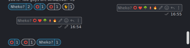 Some of the fixes this week include another crash fix for handling matrix links from your browser, notification bubbles that can show values over 9000(!), better preview images for sticker and emote packs created in Nheko, allowing you to click links in replies, a few layout and click area fixes. Nheko now also keeps track of your latest reactions and gives you easy access to them in the hover menu.